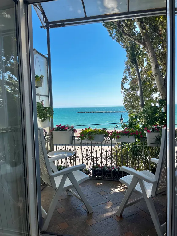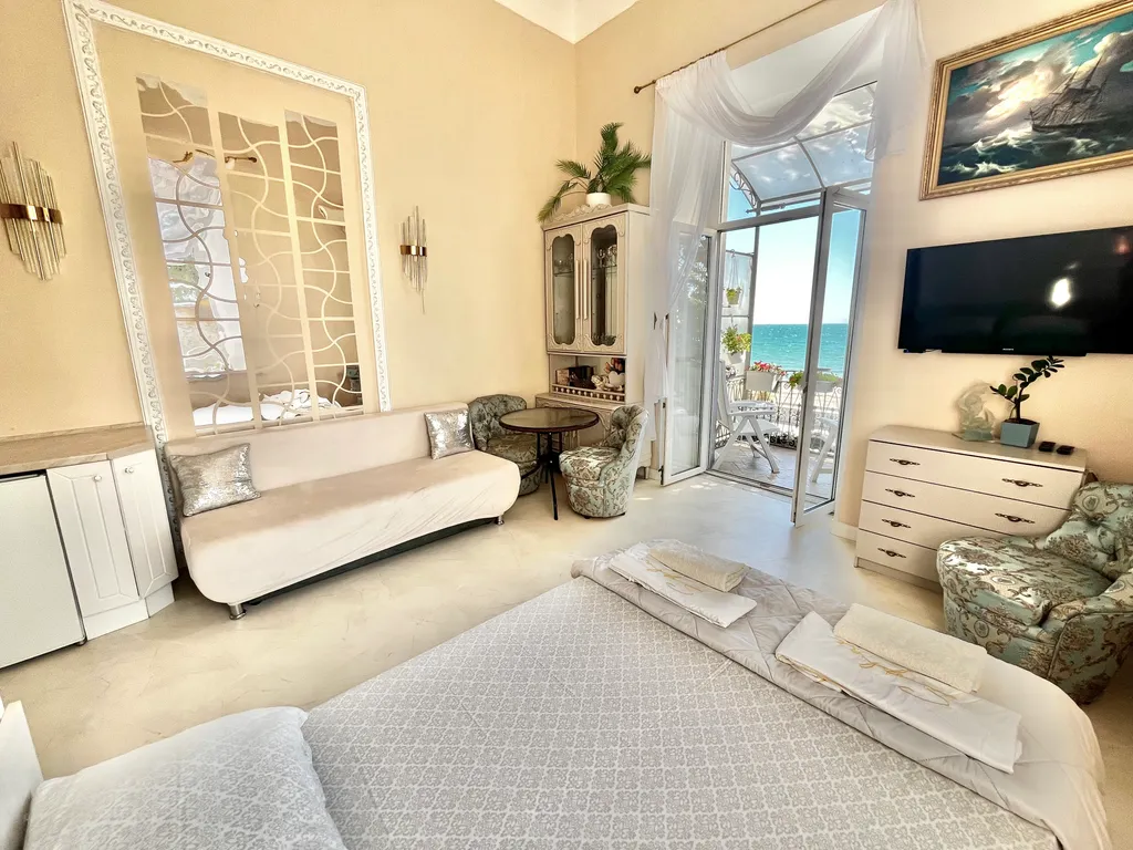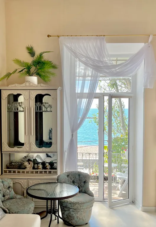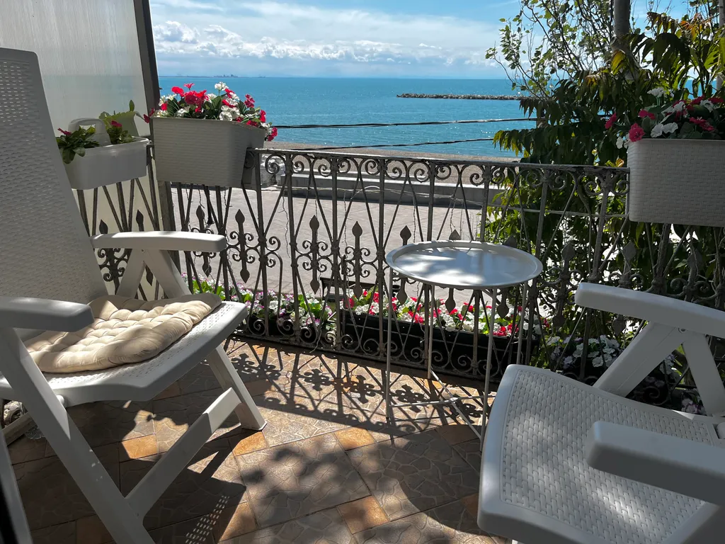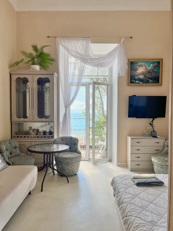 Изумительный вид на море с балкона, который выходит на набережную им терешковой. На балконе приятно будет провести время и утром за чашечкой кофе, и вечером за бокалом вина