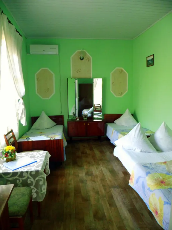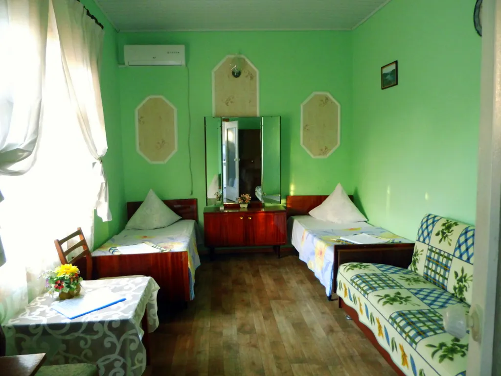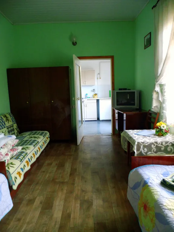 Имеется 3 кровати (2 односпальные и 1 раскладной диван), шкаф, стол, трельяж, комод, телевизор. Оборудованная кухня с газовой плитой, холодильником, микроволновкой, набором посуды и кухонными принадлежностями, совмещённый санузел, горячая и холодная вода круглосуточно. Для холодных ночей имеется обогреватель. Стиральная машинка-автомат в общей бытовой комнате. При необходимости можем предоставить детскую кроватку.